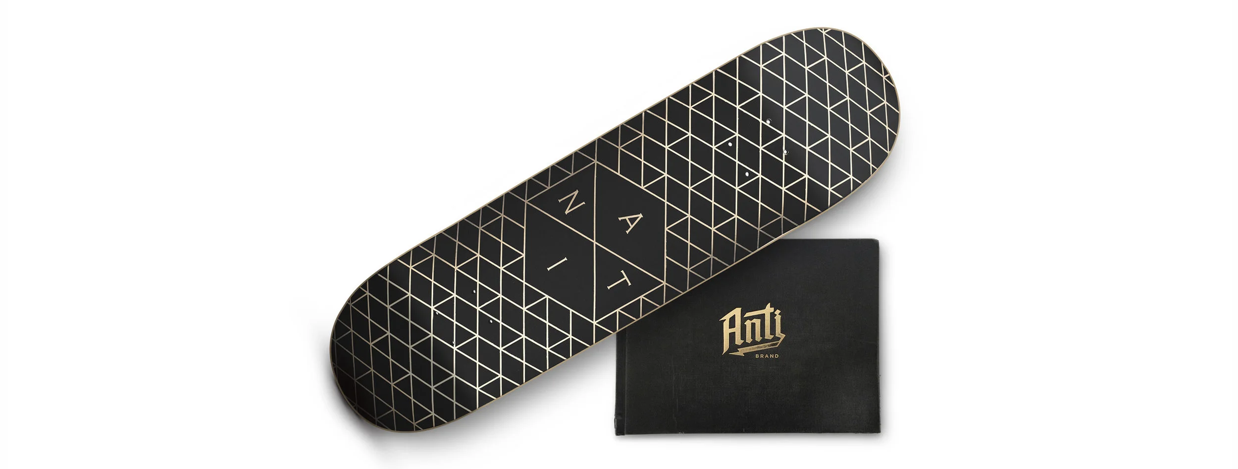 While the apparel graphics (not shown) were the focus of the collection, I was enlisted to create the identity and presentation materials. The pitch was conducted in a meeting space decorated with motorsports and action sports items to reinforce the Anti Brand story.